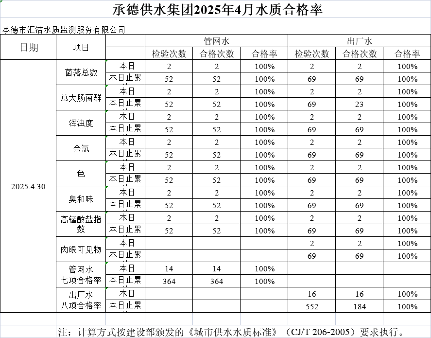 承德供水集團(tuán)2025年4月30日水質(zhì)合格率